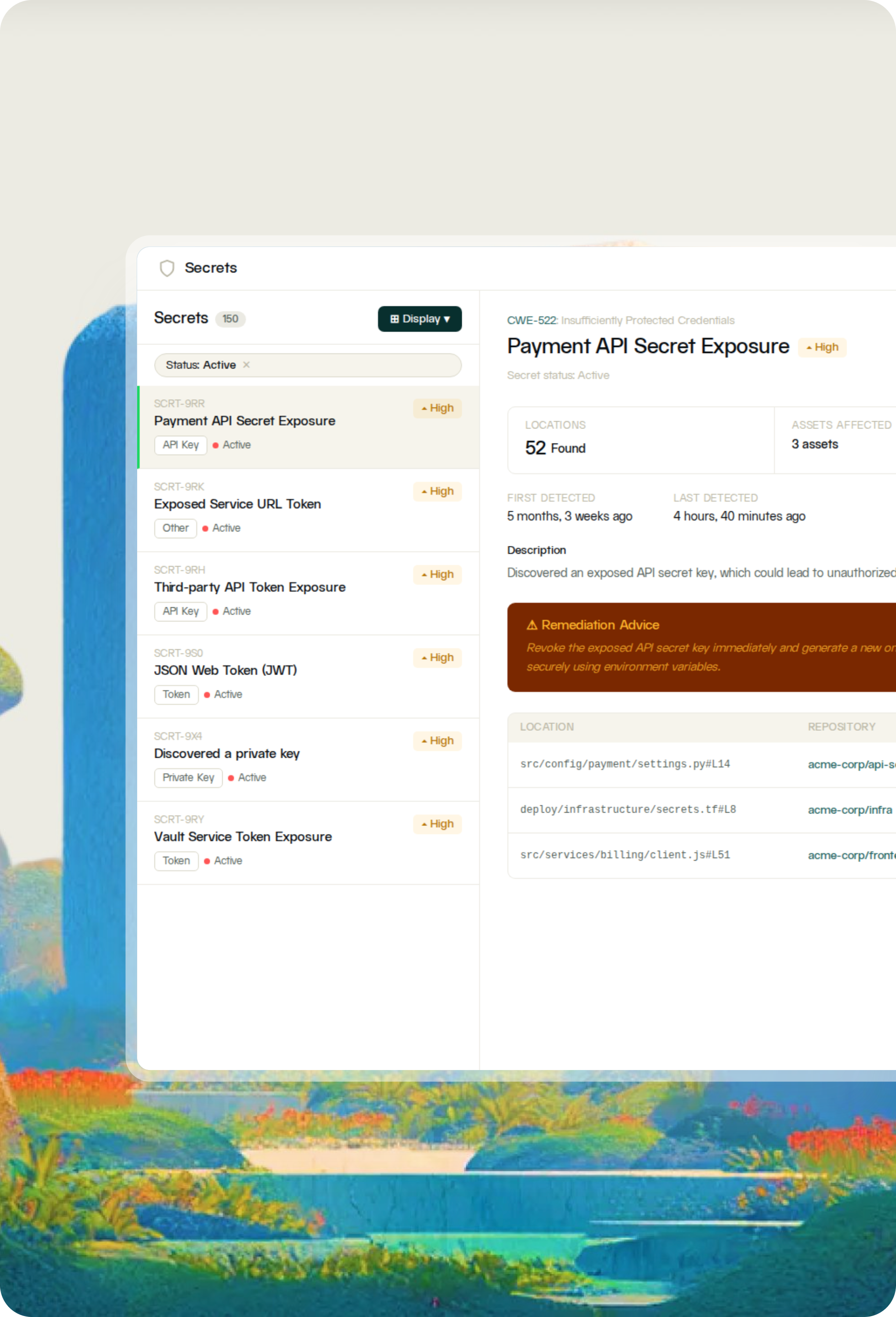 Each finding shows the exact repository, branch, file path, and line of code where a credential was found, along with how many locations it spans and how long it has been present.